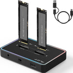 - [Better Heat Dissipation & Colourful RGB]: Dual nvme enclosure for better heat dissipation, the ssd cloning kit has an aluminium plate embedded inside the plastic casing to improve thermal performance. nvme clone also has a slight heave that market products. and hard drive duplicator are designed with colourful RGB lighting while in use for a tech-savvy look and feel.